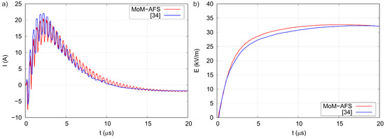 Figure 5 shows the time-domain waveforms of the current flowing through the load and the electric field at the observation point P(20 m, 20 m, 1.5 m). As in [55], it is assumed that the lightning current at the channel base is given by 20 kA, 2/25 s; thus, kA, , (1/s) and (1/s) (see Figure 2 in [55]). This means that the peak value of the lightning current pulse is 20 kA, the rise time is 2 s and the decay time to half value equals 25 s. The time-domain waveforms are obtained using IFT for the frequency samples of and multiplied by the discharge current according to (14) and (15). The obtained results are in good agreement with the results presented in [55], proving the correctness of the implementation of the algorithm in the code. The properties of the AFS algorithm are discussed during the analysis of other types of LPSs in the next section.