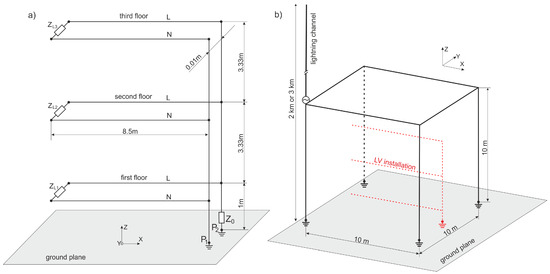 A simple single-phase model of an LV electrical installation in a building protected by an LPS is considered. The installation shown in Figure 6a consists of three loops formed by phase (L) and neutral (N) wires routed in parallel at a distance of 1 cm from each other. The installation is modeled by PEC wires of diameter 0.89 mm (i.e., a cross-sectional area of 2.5 mm2). The L wire is connected to the ground plane through the impedance , which represents the typical impedance of the cables feeding buildings [2,3]. The N wire is directly connected to the PEC ground. Parts of the LV installation are routed on three floors in the form of horizontal cables placed at the heights of 1 m, 4.33 m and 7.66 m, respectively. On each floor, the lines L and N are terminated with the loads , and , each of the resistance 1 MΩ representing an open circuit. That is, it is assumed that the devices connected to the lines are turned off. Both lines are separated by 0.5 m and 1 m from the LPS walls. The former distance is to the right of the vertical section of the LV installation. The points connecting the wires L and N to the PEC ground are localized at points P1 (9.5 m, 4.995 m, 0 m) and P2 (9.5 m, 5.005 m, 0 m), respectively. The length of the horizontal lines on each floor is equal to 8.5 m.