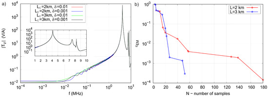 For clarity, Figure 9a shows the results for all the analyzed cases. Figure 9b illustrates the relation between the number of generated samples and the residual for the considered channel lengths. The use of a longer channel slightly increases the time required to compute a single frequency sample but reduces the effect of reflections. This means a much smaller number of samples generated by the proposed algorithm and, finally, a reduction in the total computation time. The experiments show that, for the analyzed problems, the value of the convergence error should be set between 0.01 and 0.001. For instance, for the lightning channel of a length equal to 3 km, the optimal value is . Figure 9 shows that this convergence error provides accurate results with a relatively small number of samples.