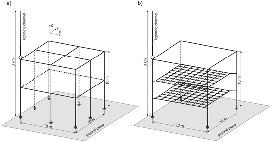 The last example shows how the LPS affects the level of noise induced in LV installations. For this purpose, two geometries are considered, starting with the ones depicted in Figure 6. The modified structures are shown in Figure 10. For the sake of legibility, the LV installation is not shown since its scheme and position remain unchanged and are the same as in the structure shown in Figure 6b. Now, LPS type 1 using the square mesh of size 5 m (Figure 10a) and LPS type 1 using the square mesh of size 10 m expanded by bonding networks (BNs) placed at the heights of 3.33 m and 6.66 m (Figure 10b) are analyzed. In the second case, BNs are located 1 m below the horizontal line on the second and the third floor. The detailed structure of the BNs is shown in Figure 11. As seen, the BNs form a square wire mesh which is connected at the corners to the LPS.