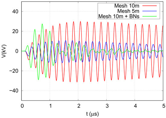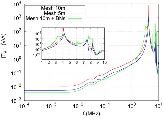 Figure 12 shows the comparison of the frequency characteristics for the voltage induced across the load for the three analyzed LPSs of type 1. The results labeled “Mesh 10 m” are obtained for the initial structure shown in Figure 6, the results labeled “Mesh 5 m” are obtained for the structure shown in Figure 10a and the results for the structure shown in Figure 10b are labeled “Mesh 10 m + BNs”. Based on the conclusions from the analysis of the results of the previous computations, the MoM-AFS simulation is performed for the frequency range from 100 Hz to 10 MHz, the lightning channel of length , the convergence error and the uniform spacing of the testing frequencies with the step size set at 100 Hz.