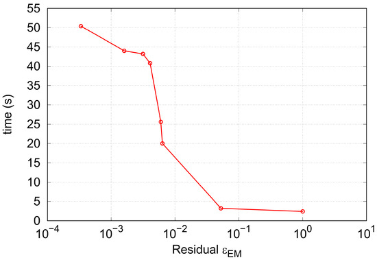 All the computations are performed on a low-cost personal computer with an Intel (R) Core (TM) i7-8700 CPU @ 3.20 GHz and 16 GB RAM. For instance, the total execution time to compute 63 samples for the structure with BNs is about 50 s (i.e., 0.8 s per sample). This means that the CPU time needed to compute 4545 samples with uniform sampling would be about 1 h. Figure 13 shows the dependence of the total CPU time on the residual for the structure with BNs. In this case, for , only 25 samples are generated and the CPU time is reduced by more than two times to approximately 20 s. The previous results have shown that already guarantees a sufficient accuracy. It seems that during the analysis of electrically small structures, can be used due to the relatively short CPU time per sample. For structures modeled by a larger number of basis functions, it seems that the convergence criterion of 0.01 should be adopted, since it allows for a substantial reduction in analysis time with sufficient accuracy of results.