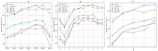 First, we analyze the effect of different frequency domain enhancement areas S on the performance of FDE-MI, as shown in Figure 3a. The adversarial samples were generated on Inc_v3 with an enhancement coefficient K = 5 and frequency domain enhancement iterations Q = 2. It can be observed that the highest transferability is achieved when S is set to 70 × 70. However, when S exceeds 70 × 70, the transferability begins to decline. This decline may be due to the larger enhancement area causing significant alterations to the image, potentially changing its semantic content.
