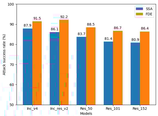 The comparison of attack success rates between FDE and SSA is shown when the enhancement frequency area S = 70 × 70, enhancement coefficient c = 5, and number of enhancements Q = 1. The adversarial samples were generated on Inc_v3, with blue representing the SSA attack success rates and orange representing the FDE attack success rates.