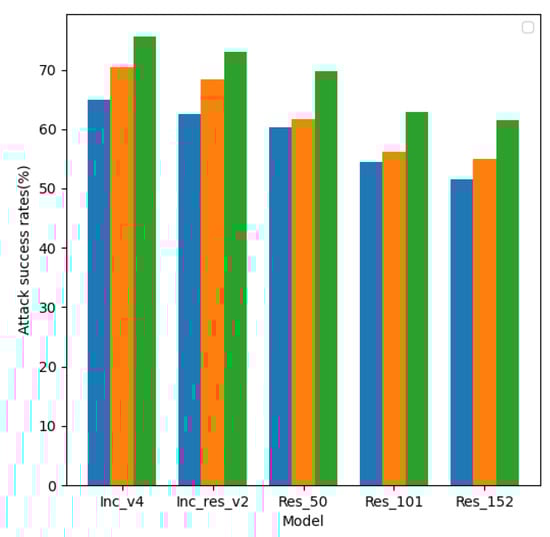 The adversarial samples were generated on Inc_v3 using FDE-FGSM. In the comparison, blue represents the success rates when applying the Hadamard product between the image’s frequency domain and weight matrix . Orange represents the success rates when applying the Hadamard product between the image’s frequency domain and weight matrix . Green represents the success rates when both frequency domain operations were applied simultaneously.