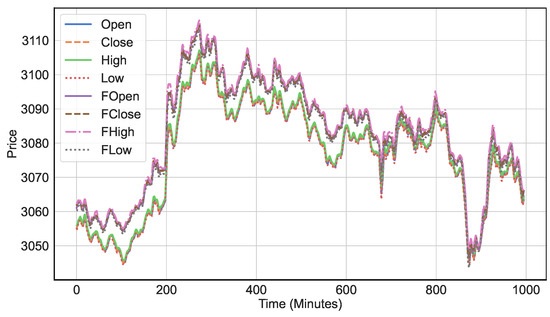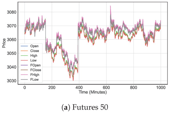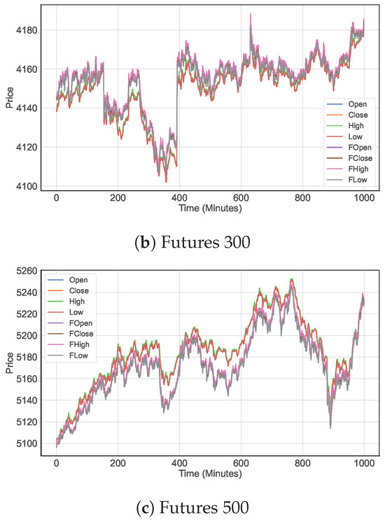 We study the Limit Order Book (LOB) framework for modeling the futures market [29], which consists of two sections in LOB: bid (buy) and ask (sell) orders. The sell orders include a price set , representing the opening, close, highest, and lowest futures prices for selling an asset at time step t. The buy orders include a price set , representing the opening, close, highest, and lowest futures prices to buy an asset at time step t. Additionally, the volume () at each time step t is recorded for the buy (sell) orders. At each time step t, these features are collected with a sampling rate of per minute. We focus on three types of datasets, Futures 50, 300, and 500, from the domestic financial market covering 36 months from 2020 to 2022, which represent certain trends in the domestic financial market. The data include all trading activities from 4 January (i.e., after the New Year’s holiday) to 30 December of each year. The daily trading hours are 4 h (corresponding to 240 points from 10:00 to 14:00) per day. With the sampling rate per minute, the test dataset contains over observations per year. After imputing missing values, we directly feed the original futures dataset into our proposed FuturesNet.