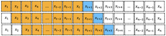 Therefore, we transform futures trading into a five-class classification. The general train and test set represents the domestic futures dataset, where contains historical records of the corresponding prices and volumes. The input has a window length T and dimension C (i.e., in the collected domestic futures dataset), and denotes the feature vector of the i-th sample at time step t. The class label of is denoted by , which belongs to the output space . Our goal is to learn a mapping function parameterized by learnable parameters , where represents the parameter space. For hyperparameter T, we apply a sliding window to extract samples from the observed time-series data to expand the training data. Each window contains a certain number of time steps within historical data. The features of each prediction include the futures prices and the corresponding volumes of the previous w trading steps to predict the upward and downward trends. Each row corresponds to a time series, where the orange part indicates the features used by the current training sample (i.e., data from the previous w time steps), and the blue part represents the target (i.e., trend change). The window gradually slides over time-series data, continuously updating the input to generate new training samples, thereby systematically constructing features and labels (as shown in Figure 3). The window size determines the length of historical data: if the window is too short, the deep learning model may fail to capture long-term patterns, and if it is too long, the training sample may include too much noise, affecting the deep model’s ability to capture trend patterns. We fine-tune the hyperparameter window size to enhance performance.