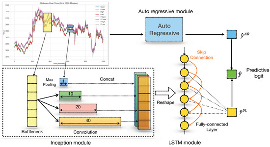 where p is the length determined by the cyclical properties of the futures market, and all dimensions share the same linear parameters set . Then, the overall prediction is obtained by combining the output of the auto-regressive module with the prediction of the deep learning module: