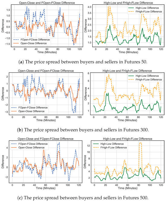 As shown in Figure 9, the open–close price spread between buyers and sellers exhibits synchronous fluctuations with periodic patterns, and substantial changes occur only at specific time steps. Conversely, the price spread between the highest and lowest prices per minute in the right subfigure tends to be more volatile than the open–close price spread. For instance, significant price fluctuations occur around 20 min after market opening in Futures 50 and 300 and between 80 and 90 min in Futures 500 due to some high-frequency trading activities during these periods.