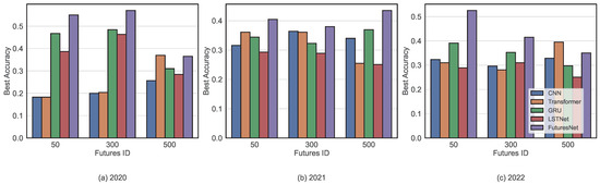 In this section, we compare the performance of our proposed FuturesNet with other competitive baselines across different futures datasets (i.e., Futures 50, Futures 300, and Futures 500) over three consecutive years (2020, 2021, and 2022). As shown in Table 2 and Figure 13, FuturesNet consistently outperforms the strong baselines across all datasets and years, especially in Futures 50 and Futures 300. These results highlight the effectiveness of capturing both long-term and short-term trend dependencies in futures trend predictions. For other competitive baselines, LSTNet shows lower accuracy, likely due to too many parameters. GRU performs as the second-best model, showing relatively high accuracy. While the CNN and Transformer perform well in Futures 50 and Futures 500 for 2021, they perform relatively poorly for other years.