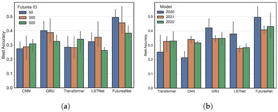 Figure 14 shows that FuturesNet exhibits remarkable stability across various futures datasets and years, in contrast to Transformer and LSTNet. GRU has achieved good performance with more fluctuation than FuturesNet, but it is still the second-best model after FuturesNet. Based on the above analysis, FuturesNet consistently achieves superior performance across various datasets and demonstrates high reliability in risk-adjusted returns at different time steps. The GRU and CNN models performed relatively well in specific years but struggled in others (e.g., with higher MAE), suggesting that these models may be sensitive to certain market conditions. LSTNet and Transformer have difficulties in fitting relatively sparse futures datasets for further adjustments in other applications.