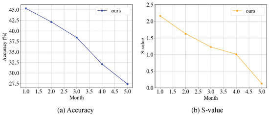 The effect of different sample sizes on the S-value and accuracy. Deep models achieve optimal performance when the training set size reaches 6–7 months. The left subfigure shows the performance curve of accuracy, and the right subfigure shows the performance curve of the S-value.