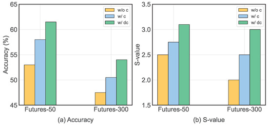As shown in Figure 19, w/ dc consistently outperforms both w/ c and w/o c variants, highlighting the importance of incorporating additional trading costs as a regularization term. The results also verify that , the regularization term , and the dynamic weighting mechanism in Equation (16) all contribute significantly to predictive performance (i.e., accuracy and S-value).