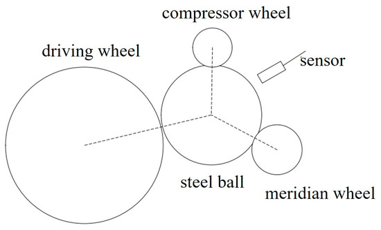 The basic principle of the meridian expansion method is to use a specific rotating mechanism to make the steel ball make a rotating movement around its axis, and gradually unfold the spherical surface along the meridian direction in order to carry out a comprehensive inspection, which is a mature technology widely used in the unfolding of bearing steel balls, and is widely adopted in the field of steel ball manufacturing and inspection due to its high efficiency and accuracy. The Aviko unfolding system was used as an example [16], and its working principle is illustrated in Figure 2. The unfolding mechanism consists of a driving wheel, a compressor wheel, and a meridian wheel. The driving wheel uses friction to rotate the unfolding wheel and the steel ball, allowing for a full surface scan of the steel ball and ensuring that the sensor can accurately detect every position [17]. However, due to the asymmetrical design of the conical surface of the unfolding wheel, uneven forces are applied to the steel ball, which affects the uniformity of the unfolding process.