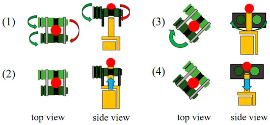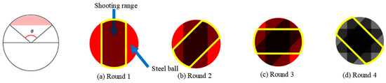 Kawabata et al. [18] proposed an expansion method for photographing the surface of a steel ball one at a time using a roller and a rotating shaft. In this method, a steel ball is placed on a rotating roller, and the ball is gradually rotated by the control of a rotating shaft to capture the image of the surface of the steel ball one by one, and the unfolding process is shown in Figure 3. The rotation of the roller ensures that the steel ball remains stable during the photographing process, and at the same time, by adjusting the angle of the rotary axis, it can cover different areas of the surface of the steel ball. In the shooting process, the entire surface of the steel ball is divided into multiple areas, one area is shot each time, and a complete image of the surface of the steel ball is finally obtained by rotating one after another, and the image shooting process is shown in Figure 4. Although this method can acquire information on the steel ball surface in a more comprehensive way, 32 images need to be taken for each ball to cover the whole surface, which is less efficient for detection. At the same time, due to the possible overlap between multiple images, it leads to the need to additionally consider how to deal with these overlapping areas during image processing to prevent data redundancy or errors.