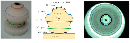 The specular reflection expansion method [27] is a steel ball surface unfolding method based on the optical reflection principle, by placing the ball on a plane consisting of multiple mirrors, the full surface unfolding image of the ball is finally obtained on the plane by simulating the reflection of light rays from the surface of the ball to the mirrors. In this study, the axial cone mirror is used for the full expansion of the surface of the steel ball, and only two shots are needed to obtain the complete surface image, which greatly improves the efficiency of the full expansion of the surface of the steel ball. As shown in Figure 5, the top and surrounding images of the steel ball can be acquired at one time by adding an axial cone mirror without changing the position of the ball several times to acquire the complete surface image, which greatly improves the efficiency of acquiring the full surface image of the steel ball. As shown in Figure 6, the detection range is from 0 degrees to 120 degrees from the top black area to the bottom green area. The axial cone mirror is a part of an inverted cone with a mirrored interior. By placing the steel ball in the center of the axial cone mirror and photographing it from the top, it is possible to directly photograph the upper part of the ball and all sides of the ball on the axial cone mirror without having to change the orientation of the ball and take multiple shots. In this way, an image of the top of the steel ball and the surrounding area can be obtained in a single shot, and an image of the bottom of the steel ball can be obtained by rotating the steel ball through the drum in a horizontal direction once, and then taking another shot. Thus, a complete image of the surface of the steel ball can be obtained in only two shots.