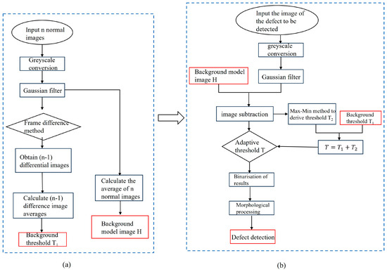 Flowchart of the improved algorithm: (a) Background modeling, (b) Acquisition of adaptive threshold and defect detection.