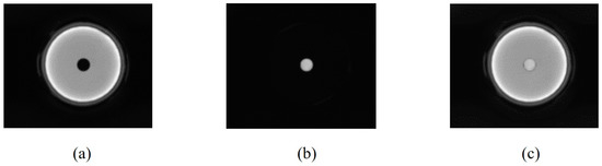 - Illumination system: The platform is equipped with two types of lighting: dome lighting and coaxial lighting. Dome lighting illuminates the entire surface of the dome uniformly, but it is supplemented by coaxial lighting to illuminate the upper area of the dome due to shadows on the top caused by the holes in the camera position. The combination of the two illumination methods ensures that the surface of the steel ball is uniformly and fully illuminated, avoiding the detection of blind spots due to uneven lighting. Figure 9 shows the results of the different illumination methods: when only the dome lighting is used (Figure 9a), the upper part of the steel ball is dark; when only the coaxial lighting is used (Figure 9b), only the upper part is illuminated; and when the two types of illumination are used at the same time (Figure 9c), the entire steel ball is illuminated.