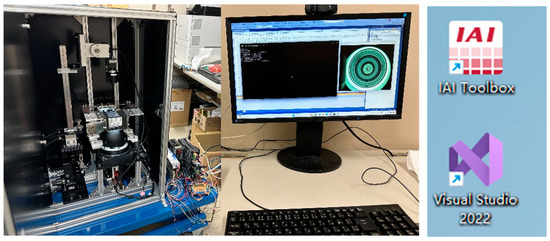The material of the steel ball to be detected is high-carbon chrome-bearing steel with a diameter of 12.7 mm. The hardware device is controlled by IAI toolbox software (https://www.intelligentactuator.com/iai-software/), and the overall algorithm is implemented by Visual Studio 2022 software, which can be performed by an ordinary PC to avoid the waste of computing resources. Figure 10 shows the composition of the detection device and the steel ball to be detected. Figure 11 presents the defect detection platform for steel balls set up in the laboratory environment. Table 1 lists the names and models of the key components of the detection device.