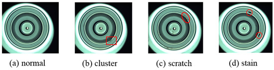 During the image acquisition process, the axial cone mirror unfolding technique is utilized to obtain a complete surface image of the steel ball in only two shots, achieving a full surface unfolding. This full unfolding converts a 3D surface into a 2D plane image through optical reflection, ensuring that the entire surface of the steel sphere is captured in its entirety and without omission. The combination of a telecentric lens and an optimized illumination system ensures that the image remains high resolution and low distortion during the unfolding of the surface of the steel ball, especially in the edge areas where details remain sharp. This seamless full-surface unfolding design allows for full detection of defects throughout the entire sphere, successfully realizing the full unfolding of the steel ball surface. Figure 12 shows an image of the unfolded surface of a steel ball, and Figure 13 shows samples of the captured image, which include a normal steel ball surface image and three types of defect images.