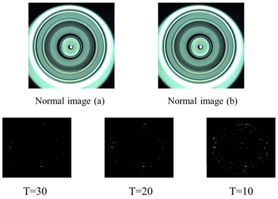 Step 1: (i) subtract normal image (a) from normal image (b); (ii) set the binarization thresholds to 30, 20, and 10, respectively; the results are shown in Figure 14; and(iii) find the appropriate binarization threshold to minimize the difference between the two normal images and prepare for the subsequent detection of defective regions.