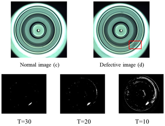 Step 1: (i) subtract the normal image from the defective image; (ii) set the binarization thresholds to 30, 20, and 10, respectively; and (iii) compare these results with the previous results, and the results are shown in Figure 15.