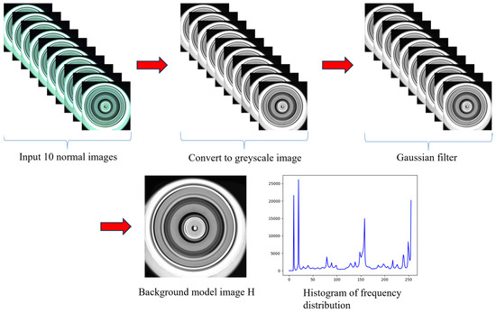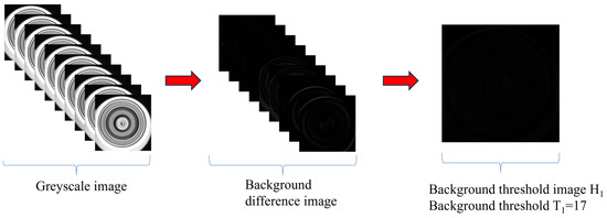 Step 4: For the n grayscale images, apply the adjacent frame difference method to obtain the n − 1 background difference images, and then compute their average value to obtain the background threshold image T1. Then, calculate their average value to obtain the background threshold T1, and the calculation formula is shown in Equation (5). The final background model image and background threshold are generated for subsequent defect detection.