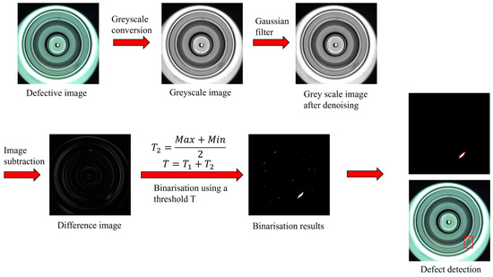 Background difference [19] is a commonly used method in image processing and computer vision, and is mainly used to separate foreground targets from video sequences or image sequences. Its basic principle in the field of defect detection is to compare the input image with the background image to detect possible defective regions in the image, and its main process includes background modeling, foreground detection, thresholding, and post-processing. First, background modeling [20] is performed with the aim of obtaining a stable background image, then foreground detection is performed to obtain the difference image by calculating the difference between the defective image and the background image with the following formula: