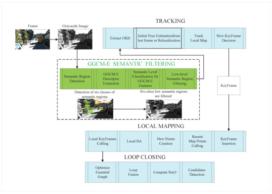 Figure 1 shows the overview of the proposed semantic filter-based ORB-SLAM3 framework. The green part is the proposed semantic filter module, which pre-processes the frames by identifying semantic patches, extracting the GGCM-E descriptor, classifying the semantic level, and filtering out low-level semantic patches to produce high-quality frames for the visual odometry. The rest of this paper is organized as follows: Section 2 briefly summarizes the related works. The proposed semantic filtering is described in detail in Section 3. Section 4 presents the experimental results and analysis. Conclusions are drawn in Section 5.