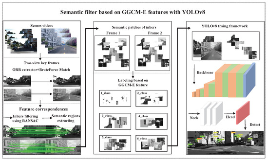 The goal of this paper is to filter out low-level semantic scenes and assist accurate vSLAM. In deep learning-based methods, data describing target objects can be pre-collected, labeled, and used to train a network. The model can predict objects with similar features in scenes. As illustrated in Figure 2, we initially focus on collecting semantic patches of inliers using challenging KITTI sequences, and we capture real environments [31]. Firstly, ORB brute force matching is performed on key frames calculated from these sequences, resulting high-ratio potential mismatches. Referring to the RANSAC algorithm, low-quality correspondences are filtered out using epipolar geometry. Then, semantic patches of size centered on the inlier are extracted. The prior study indicates that the semantic filter with n = 33 shows the best performance in the vSLAM system. To extend the generalization on complex scenes, a YOLOv8-based network is pre-trained using semantic patches with the size of n = 33, since the YOLOv8 network provides high accuracy, low computation, and high flexibility in target detection. Finally, these semantic patches are classified into different classes according to GGCM-E features.