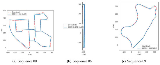 As presented in Table 3 and Table 4, after filtering out the five-class and the six-class semantic scenes, the ATEs are effectively reduced. The six-class semantic filter-based vSLAM achieves the top performance, such that the root mean square error (RMSE) is reduced by about 17.4%, and the maximum and minimum localization errors are the lowest in the experiments with the KITTI07 sequence. The RMSE of the experiment with the KITTI05 sequence is diminished by approximately 13.7%, and the minimum localization error is the lowest. This indicates that vSLAM is more accurate when the low-level semantic scenes in patches labeled 13, 14, 15, and 16 are filtered out. As described previously, these labeled semantic patches contain blurry and dense texture-rich scenes, resulting in trajectory errors. We hence conclude that filtering out these semantic patches leads to the least loss in localization precision and trajectory estimation. Consequently, the six-class semantic patches are low-level semantic scenes, requiring further research on their performance on vSLAM systems. Accordingly, the six-class area was selected as the filtering region. Moreover, further comprehensive experiments were conducted in diverse scenarios through GGCM-E+ORB-SLAM3. As demonstrated in Figure 6, the trajectory provided by GGCM-E semantic filter-based vSLAM effectively completes loop closure with highly accurate ground-truth disparities.