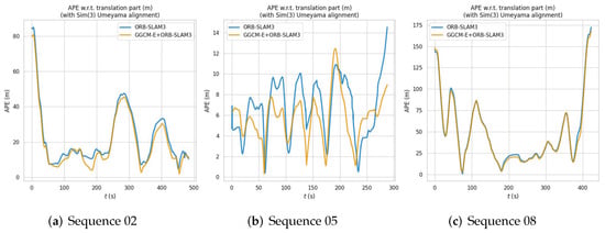 In Table 7, the GGCM-E filter was integrated with Structure-SLAM [33], LDSO [34], and DynaSLAM, and a comparative assessment was conducted on KIITTI sequences. The experimental outcomes indicated that the filter exhibited enhanced performance for Structure-SLAM and DynaSLAM, and the RMSE was diminished across all sequences, which substantiates the filter’s role in feature-based vSLAM. The impact of generality on the GGCM-E+LDSO on 05 and 06 sequences is contradictory. The RMSE increased somewhat, and the error increased compared to LDSO. We hypothesize that this may be due to the fact that LDSO is a direct-method SLAM and due to the localization accuracy being less correlated with the local complex texture region.