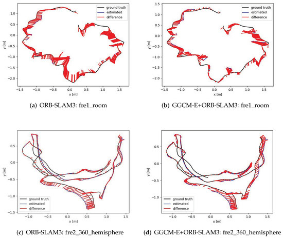 Table 5 presents the comparison of RMSE metrics of the ATEs of various vSLAM methods. We compare the results obtained by ORB-SLAM3, GGCM-E+ORB-SLAM3, and our previously proposed Inliers-Outliers+ORB-SLAM3 semantic filter, where the semantic filter is generated using a Faster R-CNN learning-based method [8]. It can be concluded from these results that the semantic filter based on GGCM-E features is more effective than the inlier–outlier semantic filter. After filtering out low-level and dense texture-rich semantic scenes, the quality of feature correspondences was effectively improved, thus decreasing the RMSE of camera trajectories in vSLAM systems, such that the largest reduction was by about 17.44%.