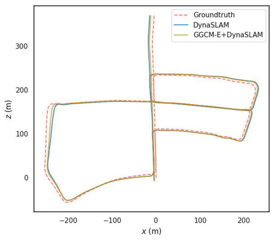 To evaluate the generalization of the proposed semantic filter, we implement it in other vSLAM systems and conduct several experiments on KITTI sequences. Considering the case of dynamic target filtering, DynaSLAM is selected as the baseline algorithm for a comparison with [20]. The results presented in Figure 11 show that the GGCM-E semantic filter-based DynaSLAM works well concerning camera trajectory estimation, especially around the straight camera path, improving the camera trajectory with the help of a semantic filter, indicating the superiority of the semantic filter on low-level semantic scene filtering, even after dynamic target filtering.