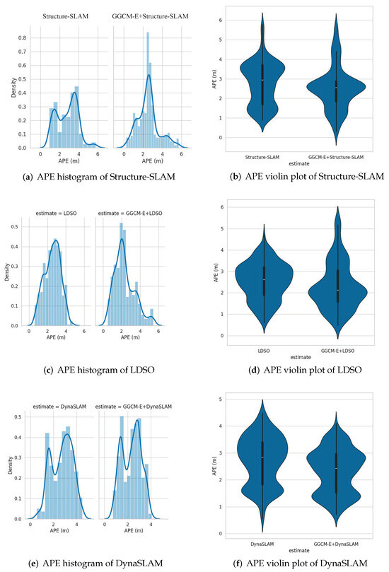 In Figure 12, the present study compares the error details of Structure-SLAM, LDSO, and DynaSLAM with the applied GGCM-E semantic filter in accordance with the KITTI07 experiment, respectively. The results demonstrate that the majority of SLAMs with the GGCM-E semantic filter have a notable reduction in the high error portion. The minimum errors obtained are effectively reduced, although the maximum errors are higher with GGCM-E+LDSO. It is notable that all SLAMs with GGCM-E semantic filters exhibit a reduction in APEs compared to those without such filters. The above experiments demonstrate that the proposed semantic filter is capable of filtering out low-level dense texture-rich scenes, being suitable for various vSLAM systems in challenging complex scenes. Consequently, filtering out low-level semantic information in dense texture-rich scenes using a GGCM-E-based semantic filter will generate high-quality feature correspondence, thus helping vSLAM achieve accurate and robust trajectory reconstruction and mapping.