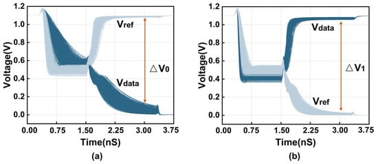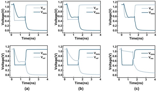 Figure 3c shows the latch stage. In the P3 stage, the DSOC-SA acts as a voltage-sensing amplifier, rapidly amplifying the voltage difference (ΔV) developed in P2 to produce digital signals (0 or 1), where ΔV = Vdata − Vref. Although transistors M1–M4 may generate an offset voltage due to process variations during the transition from P2 to P3, this offset voltage is negligible compared to the ΔV achieved in P2. Therefore, unlike the OCCS-SA, the DSOC-SA can efficiently convert ΔV into a rail-to-rail output without requiring additional capacitors or a large latch circuit at the output.