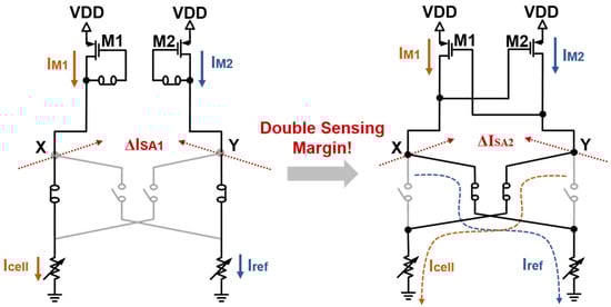 Figure 5 illustrates how the DSM structure enhances read reliability. Given sufficient pre-charge time, by the end of the P1 stage, the current through transistor M1 (IM1) becomes Icell, while IM2 equals Iref, resulting in a current difference of ΔISA1 between nodes X and Y, where ΔISA1 = IM1 − IM2. When the P2 stage begins, switches S7 and S8 are on, and the current through transistor M1 becomes |Iref − Icell|. Similarly, IM2 = |Icell − Iref|. This amplifies the current difference between nodes X and Y to 2 × ΔISA1, effectively increasing the sensing margin. Moreover, the DSM structure can correct current sampling errors from the P1 stage. If the target cell is in the SET state (Icell > Iref), then during P1, IM1 > IM2, leading to Vdata < Vref in P1 and Vdata > Vref in P2. If process variations cause transistor mismatches that lead to IM1 < IM2, a sampling error occurs in P1, resulting in Vdata > Vref by the end of P1. When switches S7 and S8 are on, Icell discharges node Y. Due to strong positive feedback, Vref continues to decrease toward the ground. As long as Icell and Iref are not reversed, the DSM structure can correct the current sampling error caused by transistor mismatches.