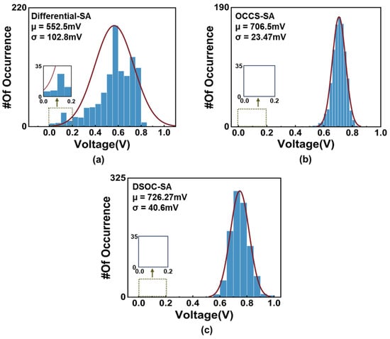 Figure 8 presents a comparison of the ΔV distributions across different designs. To ensure a fair comparison, all sense amplifiers were simulated using transistors of the same size. Due to the mismatch in the current mirror structure of differential SA, an offset between the reference current source and the mirrored current source leads to a lower average ΔV compared to the other two structures. In contrast, the DSOC-SA, with its dual-sensing-margin structure, shows an average ΔV similar to that of the OCCS-SA. Additionally, the offset compensation in both DSOC-SA and OCCS-SA results in smaller ΔV variations than in the differential SA. Notably, for ΔV < 0.2 V, the differential SA shows a broader sample distribution, while DSOC-SA and OCCS-SA exhibit no sample distribution within this range. This indicates that differential SA is more likely to cause sensing errors when the voltage of SA_OS is larger, while DSOC-SA and OCCS-SA offer improved readout reliability.