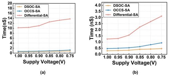 Variation in sensing delay with supply voltage between differential SA, OCCS-SA, and DSOC-SA: (a) Read 0; (b) Read 1.