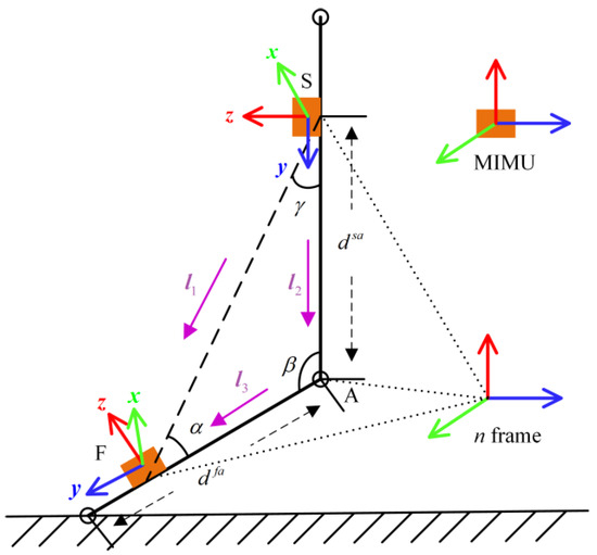 We ensured that the foot and shank conformed to the assumed biomechanical constraints of the lower limb, i.e., the ankle joint was a ball and socket joint. According to [21], lower limb segments are regarded as linkage structures. The foot and shank are connected directly by the ankle joint. Therefore, the foot, shank, and ankle joint can be considered as a structure where two straight lines intersect. The MIMU mounted on the foot and shank can be viewed as three points on the same plane as the ankle. This forms a triangular structure. The distance from foot to ankle and the distance from shank to ankle can be measured directly with a ruler. Then, some properties of the triangle can be considered to construct the constraint model, such as the interior angle of a triangle being equal to 180°.