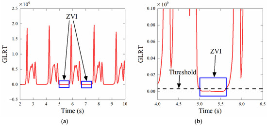 A generalized likelihood ratio test (GLRT) method was employed to judge the ZVI [30], and the formula can be written as