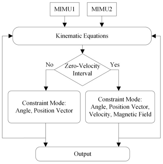 To expand the application range, it is an option to achieve precise positioning in three-dimensional space by integrating auxiliary equipment and INS. In [12], the GPS and INS were fused by utilizing a Kalman filter framework to correct step size and heading. In [13], the distance measured by wireless fidelity was integrated with low-cost MEMS sensors to realize indoor positioning. Through information fusion, the advantages of different devices can be utilized to improve the positioning accuracy. Besides, INS can also integrate with other devices (e.g., radio frequency identification, Bluetooth, etc.) to locate pedestrians [14,15,16]. Auxiliary equipment contributes to improving the positioning accuracy of pedestrians, but there still exist some disadvantages. In a scene with serious occlusion, the positioning accuracy is not satisfied for users since the GPS signals are weak. Moreover, because pre-installed auxiliary equipment is easily destroyed in some complex outdoor environments (e.g., earthquake, forest fire, etc.), the usage scenarios of pre-installed auxiliary equipment have certain limitations. To overcome the above shortcomings, camera and ultrasonic sensors were introduced in [17] and [18], respectively. Different from the preinstalled auxiliary equipment, the additional sensors were attached directly to the body. Then, they were integrated with INS to extend the scope of use and reduce the risk of damage. Unfortunately, due to the large size of these sensors, they are inconvenient to wear. Based on the above situation, using IMU instead of other sensors to form a multi-IMU positioning system becomes another choice. Meng et al. [19] utilized seven inertial sensors combined with the biomechanical model of both lower limbs to realize the positioning. The waist was regarded as a reference point by the author. The limb segment length and the limb segment direction estimated by the measuring unit were utilized. The waist position was calculated separately from the two lower limbs. Then, the waist position difference from the two lower limbs was used to compensate for the estimated position of the feet. In [20], three IMUs, installed on both feet and waist respectively, were employed. The limbs were regarded as linkage structures. Limb length, joint angle, and joint degree of freedom were used to construct geometric constraint models. The three IMUs formed a complementary constraint relationship. By constructing observation equations, constraints were imposed on the positional errors in the state variables. In [21], for unilateral lower limbs, three sensors were distributed at foot, shank, and thigh. The lower limb was considered as a linkage structure. Based on the biomechanical relationship of lower limbs, the Denavit–Hartenberg algorithm was employed to calculate the position of the thigh. More measurement information can be obtained by multiple sensors. Therefore, integrating multiple sensor information helps to improve the accuracy of the positioning system. However, it increases the investment in hardware and the complexity of the system. To improve wearability and reduce system complexity, the INS formed by dual sensors is a preferable alternative. In [22], the sensors formed a two-foot-mounted PINS. The distance between the two feet was used as a constraint condition. A spherical three-dimensional constraint model was established by utilizing the inter-foot distance. Once the estimated distance of the feet was greater than the constraint, the foot position would be projected onto the constraint model. Similarly, refs. [23,24,25] made improvements on the constraint methods. However, the improved dual-foot method is essentially a distance constrained algorithm as well. The two feet are isolated from each other and there is no direct kinematic relationship between them. Without auxiliary sensors, it is difficult to obtain accurate distance between two feet. Consequently, the foot-to-foot distance constraint can only limit the maximum value of the step length. Thus, there is still a positioning error.