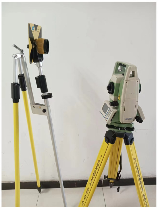 In this study, ICM-20948 produced by American Invensen Company (San Jose, CA, USA) was utilized as the measurement unit. It contained a 3-axis accelerometer, 3-axis gyroscope, and 3-axis magnetometer. The sampling frequency of the sensors was selected as 100 Hz. Figure 5a shows a hardware circuit in which STM32F411 is used as the main control unit. The distribution of sensors is shown in Figure 5b. Time synchronization between sensors was realized by a controller area network bus. Additionally, to obtain the curve graph of the planned trajectory, a total station was utilized. Figure 6 shows the total station.