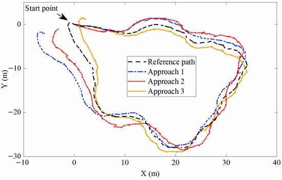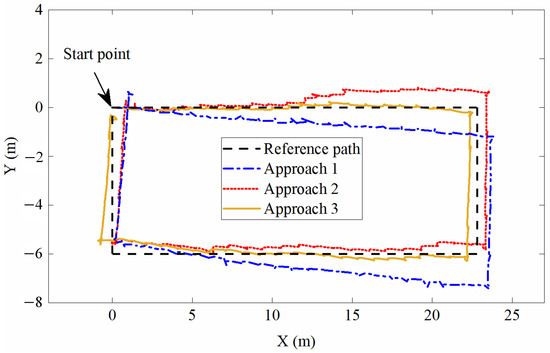 Firstly, along the edge of the square brick (0.6 m × 0.6 m), a rectangular closed-loop path composed of 38 square bricks (22.8 m) in length and 10 square bricks (6 m) in width was selected. The starting point and ending point were selected at the same position. The experimental results are shown in Table 1. The distance errors of Approaches 1, 2, and 3 accounted for 4.44%, 3.16%, and 2.52% of the total displacement, respectively. Compared with Approaches 1 and 2, the distance error of Approach 3 was reduced by 43.36% and 20.33%, respectively, and the distance error between the estimated end point and the actual end point was suppressed by 38.82% and 34.04%, respectively. Figure 7 shows the results of the estimated paths. It can be seen that the heading drift of the trajectory estimated by Approach 1 was large. After applying the foot-to-foot distance constraint algorithm, the positioning accuracy was improved. In contrast, the proposed method had least errors in positioning and heading angle.