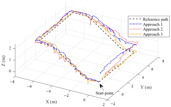 Thirdly, Test 3 was implemented indoors. To verify the three-dimensional performance, a closed-loop stair experiment was carried out. The pedestrians walked up and down stairs, eventually returning to the starting position. Each step was 0.15 m high, and a total of 14 steps was employed. Table 2 shows the three-dimensional path experimental results. Compared with Approaches 1 and 2, Approach 3 suppressed the total distance error of the path by 48.59% and 35.96%, respectively, and the height positioning accuracy was improved by 79.27% and 74.63%, respectively. It can be seen that the proposed constraint method provided better positioning results in three-dimensional scenarios. Figure 9 shows the estimated trajectories.