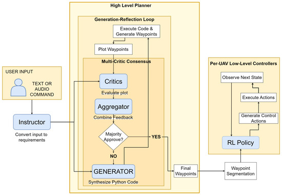 - High-level planner: The component employs four types of multimodal LLMs to process the operator’s natural language input and creates the final coordinated waypoint paths to be executed by the UAVs. The high-level planner comprises four main types of LLMs that collaborate as a multi-agent flow to achieve the audio-to-semantic conversion of the speech or audio command into a Python (v3.10) script that generates 3D waypoints. Each type of LLM is assigned unique roles that contribute to the system’s overall effectiveness. Some roles only require text input and output in the case of the aggregator LLM agent, while other roles require handling multiple modalities, such as audio in the case of the instructor LLM agent or images in the case of the critic LLM agents. We discuss the details of the high-level planner system, its LLM organization, and the roles of each LLM in the following sections.