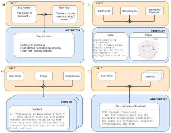 To support natural language commands in text or audio, the system leverages the natural language understanding of multimodal LLMs. The multimodal instructor LLM agent, denoted , handles both natural language text prompt p and audio commands v from the user or operator. The instructor serves as the entry point to the high-level planner system. The agent is tasked with interpreting high-level natural language instructions and converting them to requirements that capture their semantics (Figure 2 top-left quadrant a), where the agent must understand both the intended shape for drone paths and the number of drones involved in creating that shape. For instance, a user might provide a prompt to create a “star-shaped trajectory using five drones”, where each drone is responsible for tracing one arm of the star. The LLM processes the instructions, understanding the geometric requirements and the spatial coordination necessary among the drones, and then translates them into actionable requirements that lead to the generation of 3D waypoints. Mathematically, we have the following: