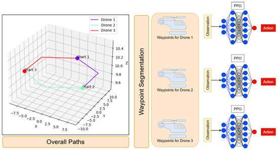 The overall trajectory is divided into individual waypoints for each drone. The waypoints, combined with each drone’s real-time observations, are then processed by the dedicated low-level policy for that UAV. The process generates the specific actions required to guide the drone’s movement.