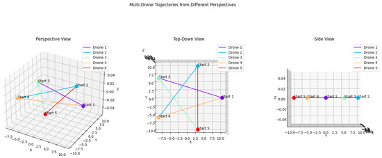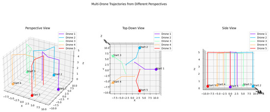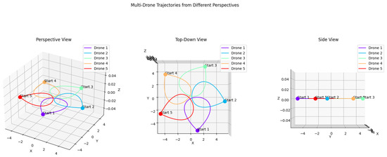 In our experiments, GPT-4o (with an average success rate of 76.0%) generally outperformed the Gemini models (Gemini: 64.0%, GeminiFlash: 50.5%), demonstrating superior capability in generating complex and accurate drone trajectories based on user-defined prompts. For example, in the star-shaped path the Gemini models (Figure 4 and Figure 5) were simpler and less aligned with the complex structure typically associated with a star. In contrast, GPT-4o (Figure 6) produced a design that was more intricate and recognizable as a star, despite the prompt to “Generate a star-shaped trajectory using 5 drones. The drones should move in such a way that their combined flight paths trace out a symmetrical star with equal arm lengths”. Not specifying a high level of detail, GPT-4o successfully captured the underlying intent of the design and created a sophisticated star pattern that reflected an advanced understanding of the desired outcome and effectively highlighted the ability to interpret and expand upon vague or minimally detailed instructions.