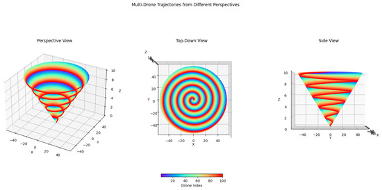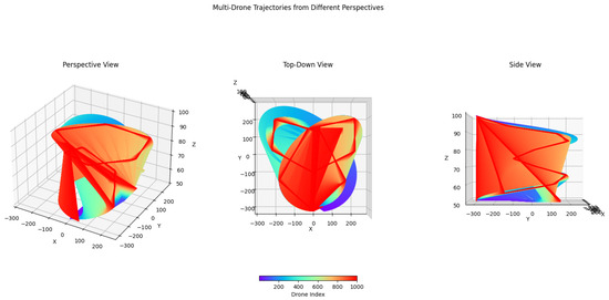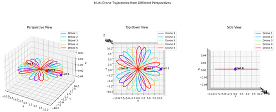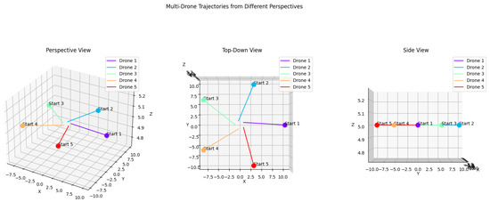 Ten trials were conducted for each path type and prompt to assess the performance of the LLM-generated paths, and the maximum number of generation–reflection cycles was set at . The primary metrics used for evaluation included accuracy, measured as the fidelity of the generated path to the intended sequence of waypoints as described in the prompt; synchronization, evaluated based on the drones’ ability to maintain coordinated movement, particularly in simple paths; and collision avoidance, assessed by observing the drones’ ability to avoid intersecting paths, especially in complex, multi-drone scenarios.